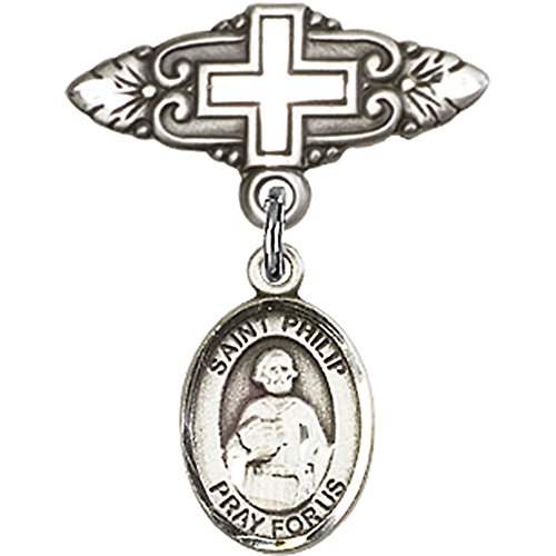 -. Title : Sterling Silver Baby Badge with St. Philip the Apostle Charm and Badge Pin with Cross 1 X 3/4 inches
