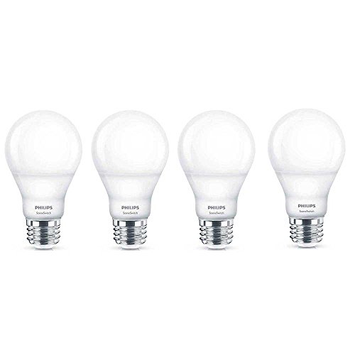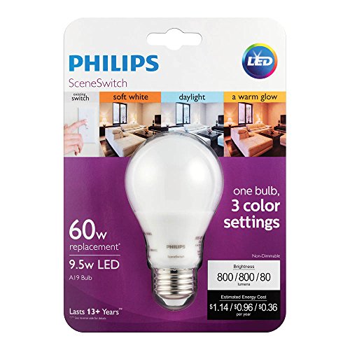 Philips LED A19 SceneSwitch 800/800/80-Lumen, 5000/2700/2200-Kelvin,9.5/8/3-Watt (60-Watt Equivalent) Light Bulb, E26 Medium Base, 3-Color, 4-Pack