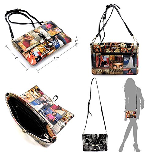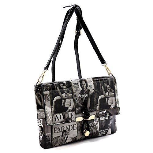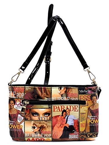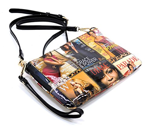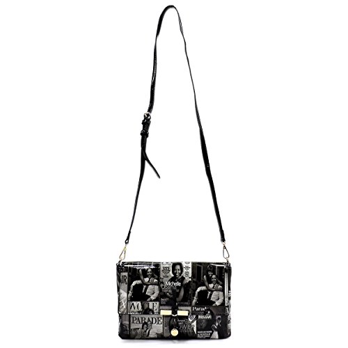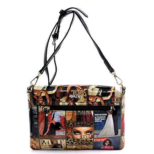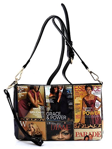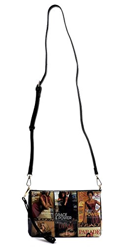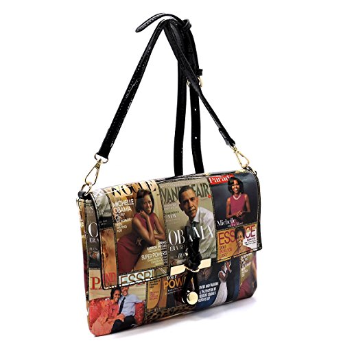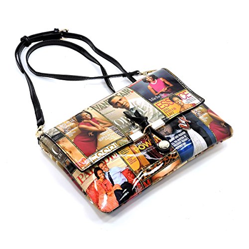 -. Brand : Elphis -. Color : Multicoloured -. Department : womens -. Feature : Made of Glossy patent faux leather (PU leather) & Gold-tone hardware / Zip top closure / Removable Shoulder Strap / Interior lining with multifunctional slip pockets and a back wall zip pocket / Simple and chic, match this perfect clutch sized shoulder bag to any outfit! -. Model : PM01X -. PackageQuantity : 1 -. ProductGroup : Shoes -. ProductTypeName : HANDBAG -. Title : Glossy Michelle Obama Magazine Cover Collage Clutch Cross Body Bag Satchel Shoulder Bag