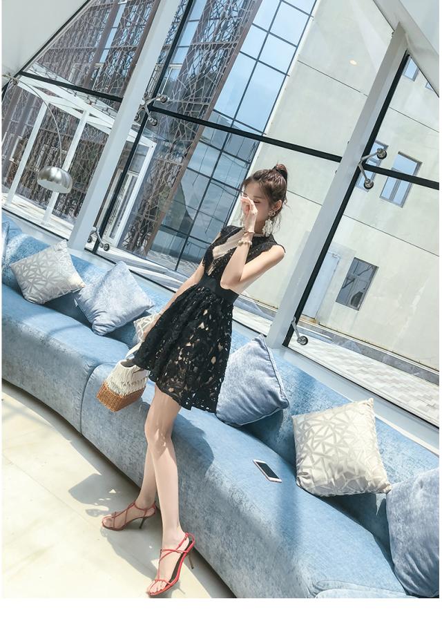 クルーネック ショート 花柄 ノースリーブ 無地 レース ドレス