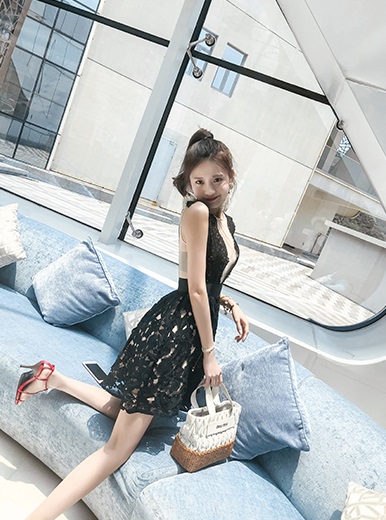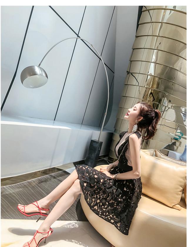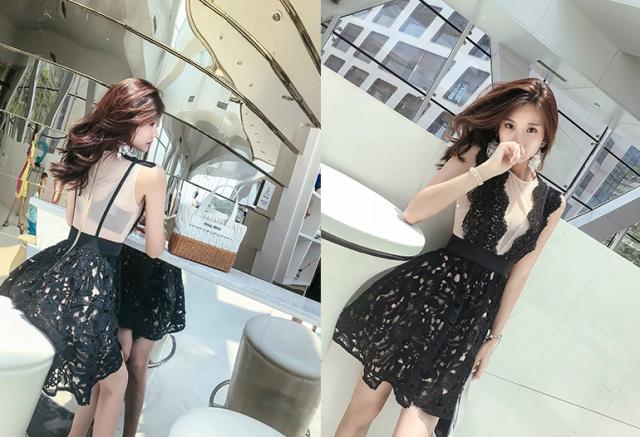 エレガントなブラックレースとメッシュレースを合わせた、ちょっぴりヌーディなデザインがセクシーなワンピース。