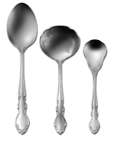 Amazon.com Matching serving utensils add a note of practical polish to the table, and this 3-piece set of Satin Dover pieces carries an air of traditional romance in the bargain. Designed for a wide range of functions, the set includes a serving spoon, a sauce ladle, and a sugar spoon. On each piece, the handle features gleaming sculptural sides, a flower and scroll border, and a satin-finish center panel. Both the ladle and the sugar spoon are lightly scalloped on the working end for a sweet touch. Pleasantly manageable in dimension, the flatware is crafted from high-quality 18/10 stainless steel with 18 percent chrome for corrosion resistance and 10 percent nickel for luster. Dishwasher-safe, Satin Dover carries a lifetime warranty and is part of Oneida's Flatware for a Lifetime program, so you can expand or refine your collection for as long as you like. --Emily Bedard What's in the Box Hostess serving set. Set includes: large serving spoon; sauce ladle; sugar spoon. 3 pieces total. 0