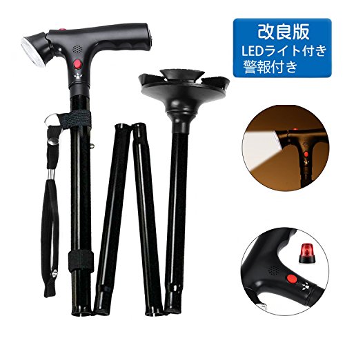 -. Feature : 【自立式/倒れない】接地面が4本脚構造ですので足首の負担を軽減します。 様々な傾斜や凹凸などに対応が可能になっていて、360°回転する4つのグリップが地面を固定する足首の役目を担っています。どんな悪路でも(坂道、芝生、砂浜、砂利、雪、でこぼこ道など)快適に安心して歩けます。 / 【LEDライト付きで夜間も安心】ボタン1つでライトが点灯。 さらに角度も調節可能なので夜間や足元が暗いところでも安心して歩くことができます。 注意:ご使用前に電池ボックスの絶縁シートを取り外して下さい。 / 【しっかり安定な補助ハンドル付き】このステッキは改良したデザインで、補助ハンドル付き、2ハンドルで足腰にかかる体重を左右に均等に分散され、両手でサポートして、立つ時足腰の圧力が減り、より安定して立ち上がれます。日頃の立ったり座ったりをもっと楽に! / 【5段階調節可能】杖の長さは85~97cmまで5段階調節可能。自分の身長に合わせてや、用途によって長さを調節して使い分けたりする事も可能です。【収納袋・予備電池付き】ステッキを折り畳んで付属の収納袋に入れれば持ち運びも楽々!さらに、予備電池1セットサービス中! / 【便利な折り畳み式】引っ張って→折り曲げて、使わない時はカンタンに折り畳み、コンパクト収納でお悩み解消。日常使いはもちろん、旅行の際にもスペースを取ることなく持っていけます。