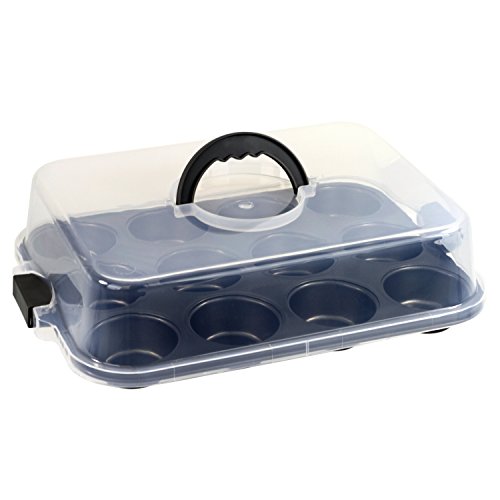 -. Feature : Non-stick 12 cup muffin pan with clear plastic locking cover. / Heavy duty Whitford non-stick silicone coating for easy cleanup. Made without PFOA/PTFE / Heavy duty carbon steel construction / Perfect for parties, picnics, and bakers on the go. / Dishwasher safe. 10 Year Warranty