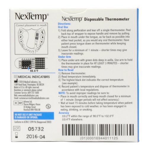 NexTemp thermometers are easy to use and easier to read than predecessor dot-matrix thermometers. Contrasting color pattern and new enhanced signal embossed dots improves visibility under a wide-variety of lighting conditions. Can be used oral or axillary. Measures temperature in Fahrenheit 96 degrees F to 104.8 degrees F. Sold 100 per box.Feature