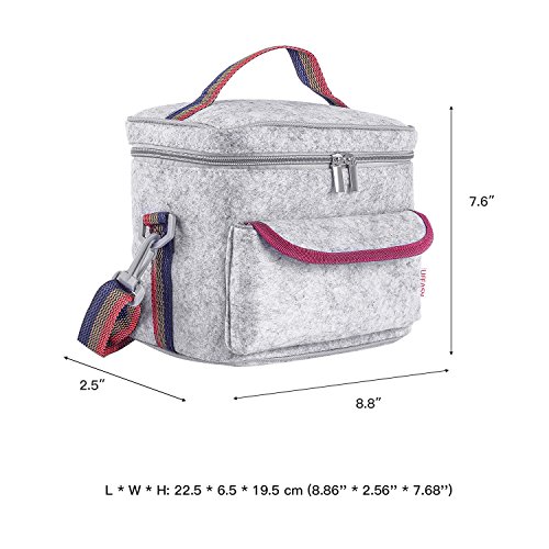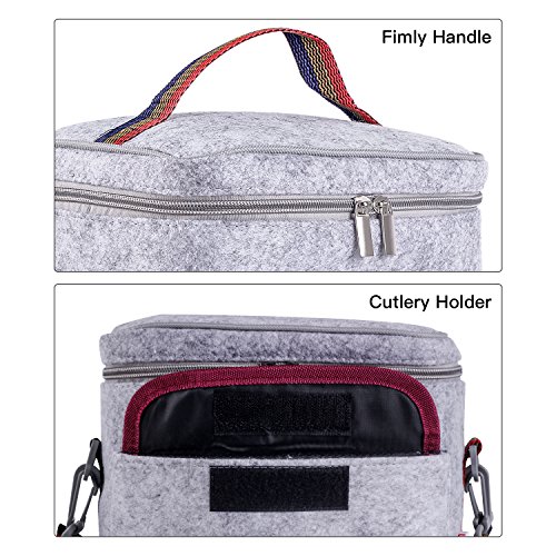-. Feature : 『PERFECT SIZE』: L x W x H: 22.5 x 6.5 x 19.5 cm (8.86'' x 2.56'' x 7.68''). Ideal for for school, work, sporting events, picnics or field trips; / 『DOUBLE INSULATION』: Eco-friendly felt fabric + food grade aluminum foil lined interior, keep hot & cold for up to 6 hours; / 『EASY CARRYING』: Shoulder strap & grab handle, adjustable length 60--105cm, suitable for both kids and adult. / 『EXQUISITE DESIGN』: Plastic buckle for Crossbody strap; With zipper & small front pockets, easy to carry forks and spoons; / 『Multi-Purpose Bag』: Great for being as lunch bag by school boys, school girls, officers; Also suitable for being used as bottle tote bags by parents.