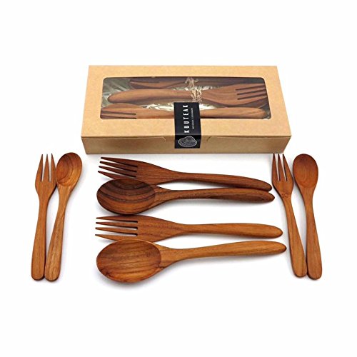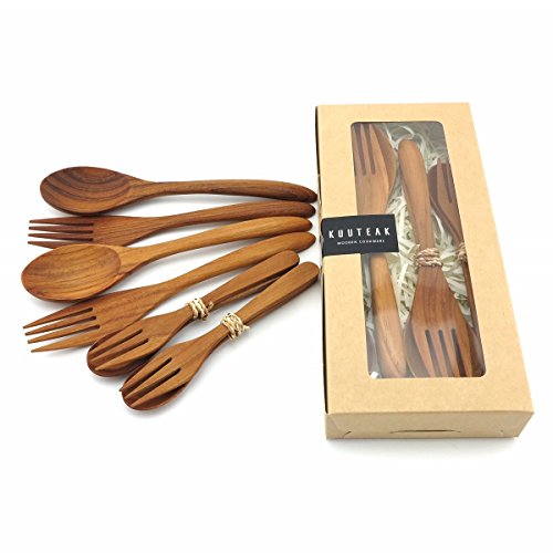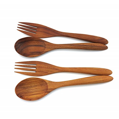 KuuTeak Wooden Spoon and Fork set For Dinner Kitchen Utensils Flatware Hand Craved Made of Teak Wood for Natural Kitchen Pack 4 set