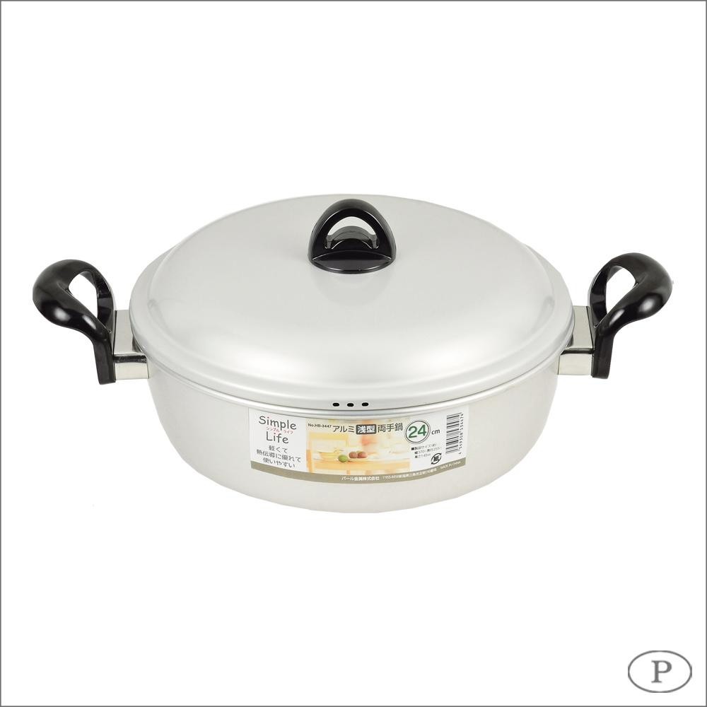 熱伝導に優れて使いやすいアルミ両手鍋です。 製造国:中国 素材・材質:【表面加工】アルマイト【材料の種類】本体・蓋:アルミニウム合金、取っ手・つまみ:フェノール樹脂(耐熱温度160度) 商品サイズ:(約)幅370×奥行255×高さ145mm(底の厚さ0.8mm)、鍋の深さ75mm 仕様:ガス火専用容量:約3.3L食洗機・乾燥機不可 ※サプライヤー直送品 ご注文後3~4営業日後の出荷となります【商品名】パール金属 シンプルライフ アルミ浅型両手鍋 24cm HB-3447