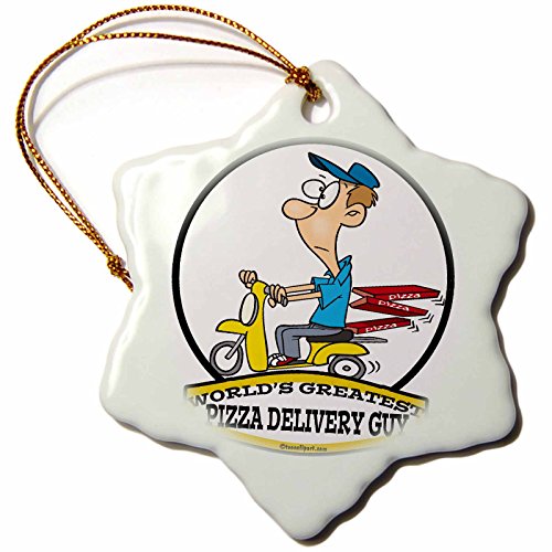 3dRose LLC orn_103446_1 Porcelain Snowflake Ornament, 3-Inch, "Funny Worlds Greatest Pizza Delivery Guy Cartoon"
