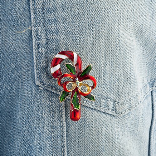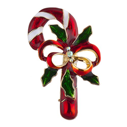 Red and white enamel candy cane brooch with big ribbon and holly details