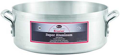 Studio : Winco Publisher : Winco Product Description Winco AXBZ-24, 24-Quart 18-3/8" x 5-3/4" Super Aluminum Brazier Pan, Heavy-Duty Commercial Grade Braiser Pan, NSF is a versatile and reliable cookware, perfect for braising meat and simmering stews. This pan is manufactured from lightweight aluminum for enduring sturdiness and exceptional temperature circulation. Due to its 4 mm/0.15" super aluminum bottom, the brazier is perfect for slow cooking of meat and vegetables. Thanks to its thick handles, this aluminum brazier pot ensures ease of handling when transporting it from the counter top to the stove top. The item is NSF certified! Dimensions: 18-3/8" Dia x 5-3/4"H. 0