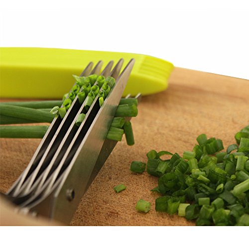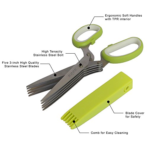 - Cut herbs directly to your meal such as topping soups, salad, etc. - Cutting fresh herbs to dishes will benefit for health and flavors. - Five 3-inch stainless steel blades cut equally portion of pieces. - Exterior PP plastic handles with interior TPR rubber for comfortable hand grip. - Plastic blade cover with cleaning comb. For provide safety and easily cleaning. - Dishwasher Safe. - Designed for both right and left hand users. - 100% Customer Satisfaction with LIFETIME warranty.
