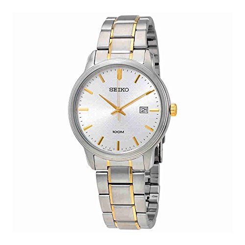 Gold-tone stainless steel case with a gold-tone stainless steel bracelet. Fixed gold-tone crystal-set bezel. Champagne dial with gold-tone hands and index and Roman numeral hour markers. Dial Type: Analog. Date display at the 3 o'clock position. Quartz movement. Scratch resistant hardlex crystal. Case size: 28 mm. Round case shape. Deployment clasp. Water resistant at 30 meters / 100 feet. Functions: date, hour, minute, second. Dress watch style. Seiko Champagne Dial Gold-tone Stainless Steel Ladies Watch SUR728.