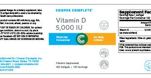 -. Binding : Health and Beauty -. Brand : Cooper Complete -. EAN : 0988565102899 -. Feature : Vitamin D3 5000IU, 1 Bottle, 120 Softgels / Take daily with a meal or as directed by your physician -. IsAdultProduct : 0 -. Label : Cooper Complete -. LegalDisclaimer : These statements have not been evaluated by the Food & Drug Administration. These products are not intended to diagnose, treat, cure or prevent any disease. -. Manufacturer : Cooper Complete -. MPN : 257 -. PackageQuantity : 1 -. PartNumber : 257 -. ProductGroup : Health and Beauty -. ProductTypeName : HEALTH_PERSONAL_CARE -. Publisher : Cooper Complete -. Studio : Cooper Complete -. Title : Cooper Complete Vitamin D 5000 IU 120 CT (1 Bottle) -. UPC : 988565102899