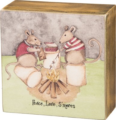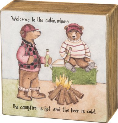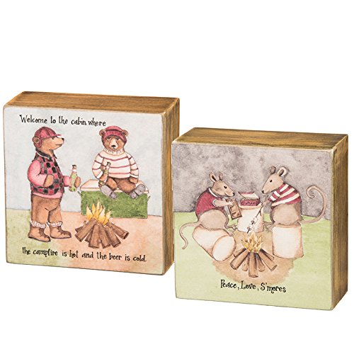 Primitives by Kathy 4" x 4" Wood Box Sign Set - "Welcome to the cabin where the campfire is hot and the beer is cold" and "Peace, Love, S'mores" - 2 Pack