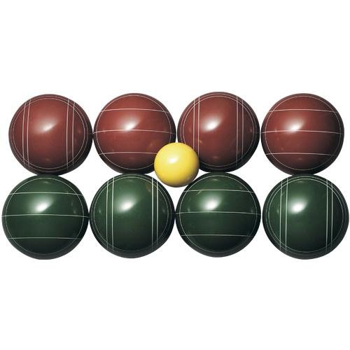 The St. Pierre Official Tournament 107mm Bocce Set features solid, one-piece construction bocce balls with precision roundness and balance. The balls are made with thermo-set composition resin and are striped for two- to four-player competition. The set is manufactured in the United States to International Bocce specifications and includes the official ball of the United States Bocce Federation. The set includes four dark green 107mm bocce balls, four dark burgundy 107mm bocce balls, one yellow 57mm pallino, and an official rule book with court layout instructions. A nylon carrying case is also included for easy storage and transportation. Bocce Ball Materials and Sizes Resin is the most popular material for bocce balls and will withstand frequent use better than other materials. Molded plastic is best for children or for beginners and can be somewhat softer although still very durable. A bocce ball that is smaller than 100mm is typically best for children or for beginners. This size is easiest to handle and toss. Tournament balls will range between 107mm and 115mm. The International Standard ball is 107mm (4.2 inches) and weighs 920 grams (2 lbs.). The occasional backyard player will most likely appreciate a size somewhere between 100mm and 110mm. Made in the USA. Eight 107 mm burgundy and green bocce balls, each weighing 920 grams. 57 mm yellow pallino. Balls solidly constructed from thermo-set composition resin. Balls etched for easy team designation. New upgraded denier carry case. Manufactured to international bocce specifications. Complete set of rules included.Feature