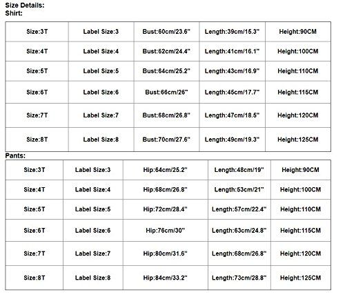 Size Details: Shirt: Size:3T ?Label Size:3 ?Bust:60cm/23.6" ?Length:39cm/15.3" ?Height:90CM Size:4T ?Label Size:4 ?Bust:62cm/24.4" ?Length:41cm/16.1" ?Height:100CM Size:5T ?Label Size:5 ?Bust:64cm/25.2" ?Length:43cm/16.9" ?Height:110CM Size:6T ?Label Size:6 ?Bust:66cm/26" ? ? Length:45cm/17.7" ?Height:115CM Size:7T ?Label Size:7 ?Bust:68cm/26.8" ?Length:47cm/18.5" ?Height:120CM Size:8T ?Label Size:8 ?Bust:70cm/27.6" ?Length:49cm/19.3" ?Height:125CM Pants: Size:3T ?Label Size:3 ?Hip:64cm/25.2" ?Length:48cm/19" ? ? Height:90CM Size:4T ?Label Size:4 ?Hip:68cm/26.8" ?Length:53cm/21" ? ? Height:100CM Size:5T ?Label Size:5 ?Hip:72cm/28.4" ?Length:57cm/22.4" ?Height:110CM Size:6T ?Label Size:6 ?Hip:76cm/30" ? ? Length:63cm/24.8" ?Height:115CM Size:7T ?Label Size:7 ?Hip:80cm/31.6" ?Length:68cm/26.8" ?Height:120CM Size:8T ?Label Size:8 ?Hip:84cm/33.2" ?Length:73cm/28.8" ?Height:125CM About Commodities:? ★1. There may be a little difference of the color between the picture and the real goods because of the pixel. We hope you can understand sincerely. ★2. Please allow slight deviation for the color and measurement. Thanks. ★3. The goods will be delivered to you about18-25 days, if you need it in urgency you can choose DHL, the delivery time is 3-5 days. Please contact us if you have question about the delivery ★4.My store updates often, you are welcome to visit here at any time. ? 0 |