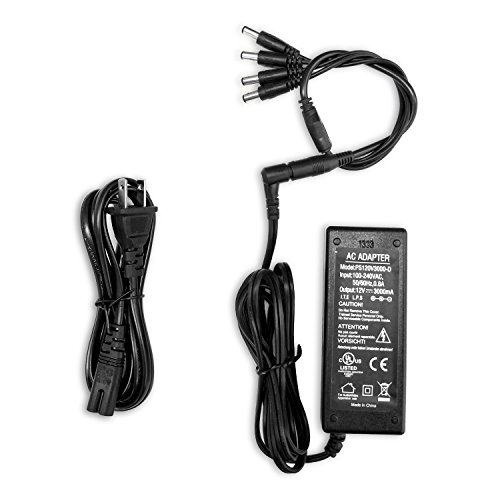 Power Supply, Savvypixel 12V 3A Power Adapter Transformer + 4 Split Power Cord for CCTV Security Camera and 5050 3528 5630 Flexible RGB LED Strip Lights, Tape Lights