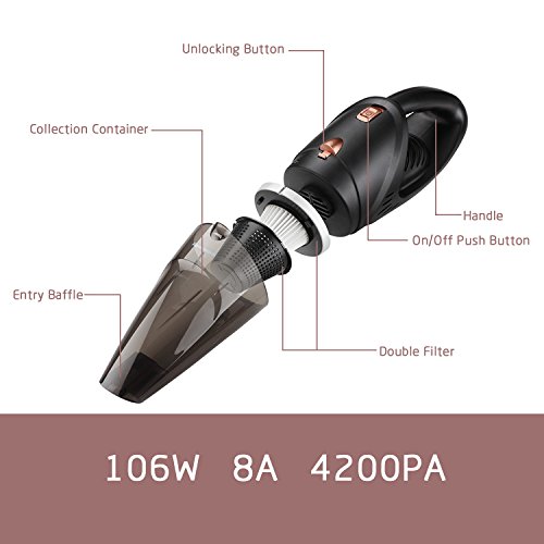 106W 4.2Kpa suction,best ideal tool to clean the dust, sand, cig ash, crumbs, pet hair and water,Let your children and pets enjoy playing in the car.