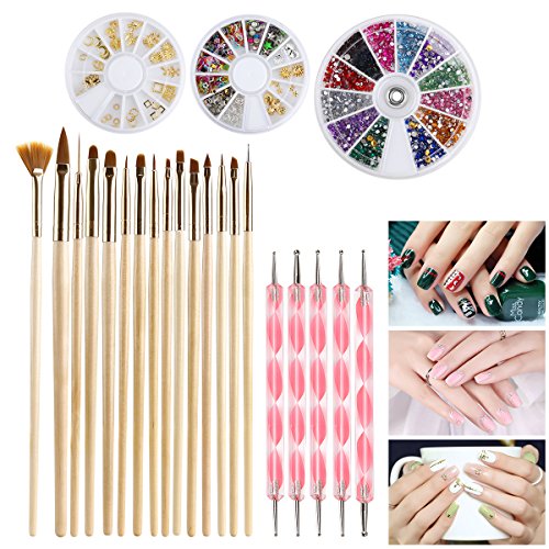 Package Includes: 15 Nail art brushes 1 Box rhinestone decorations 1 Box colorfully stud decorations 1 Box gold stud decorations 5 Dotting Pens
