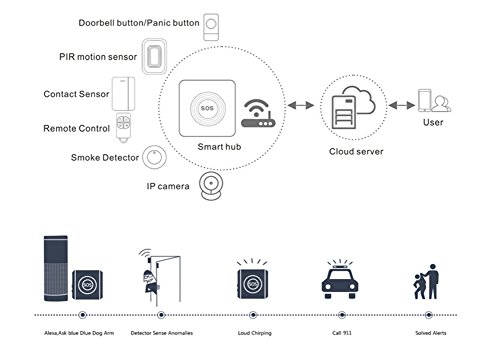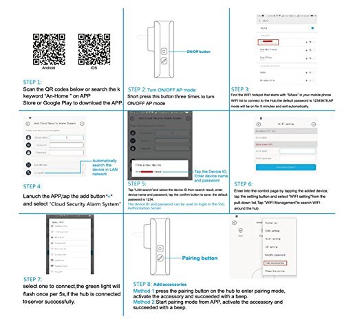 -. Feature : Works with Amazon Alexa for voice control (Alexa device sold separately) / WIFI-enabled cloud security alarm system, with 1 smart wifi hub,1contact sensors, 1 motion sensor, 1 doorbell button,1 Wireless remote control. Expandable, supports up to 50 iHoan wireless accessories. / Smart WIFI Hub is the "brain" of the system with sound & flash, No additional smart hubs are required. FOLLOW THE PICTURE ,Q&A OR VIDEO THAT IS LINKED IN THE DESCRIPTION OF LISTING TO SETUP THE HUB! / Work with Amazon Alexa for voice control; SN is the Device ID, default password is 1234. / App-enabled system, compatible with Android and iOS, control and monitor home security anytime anywhere. please search "SSG An-home" to install the An-home app.