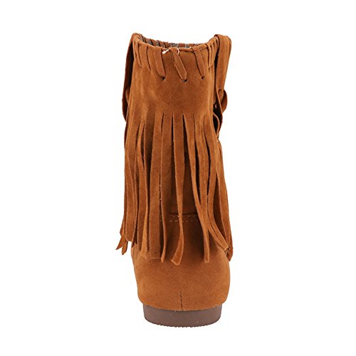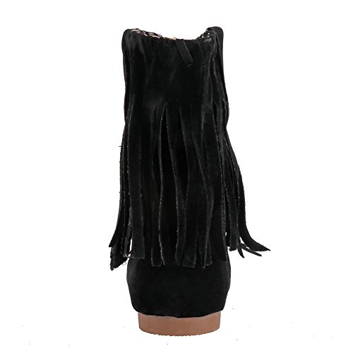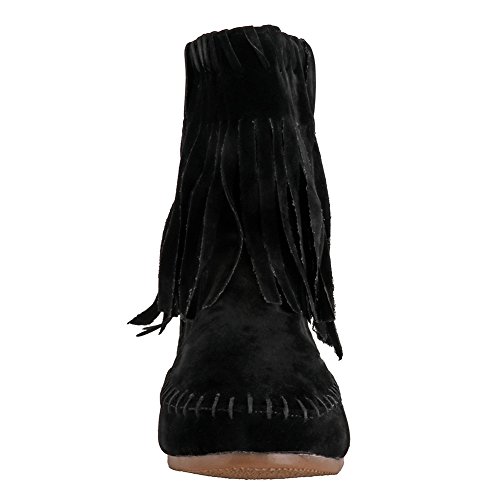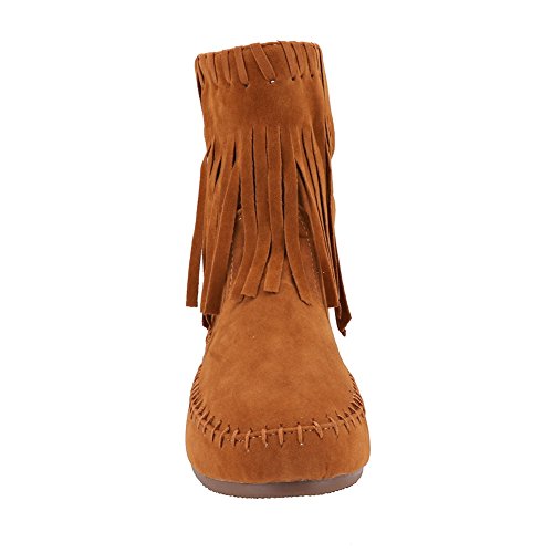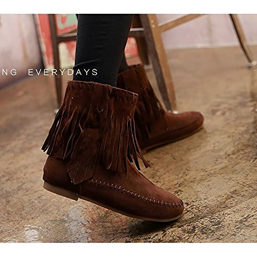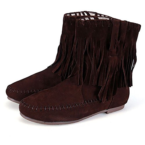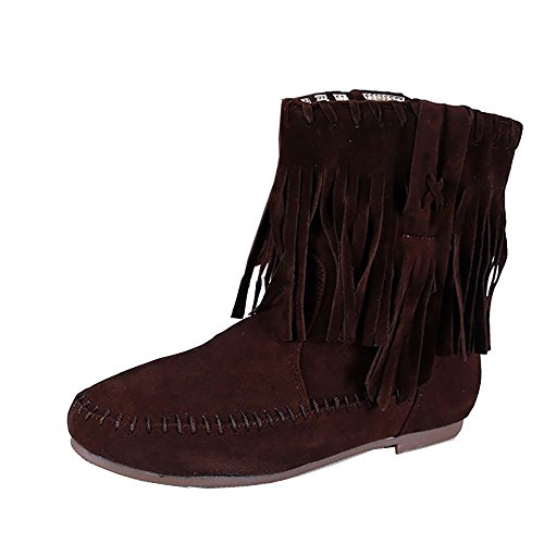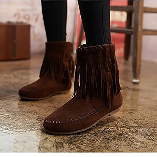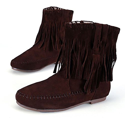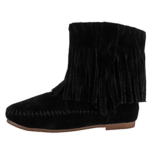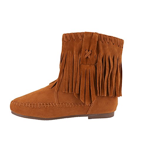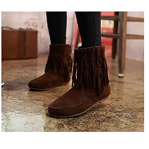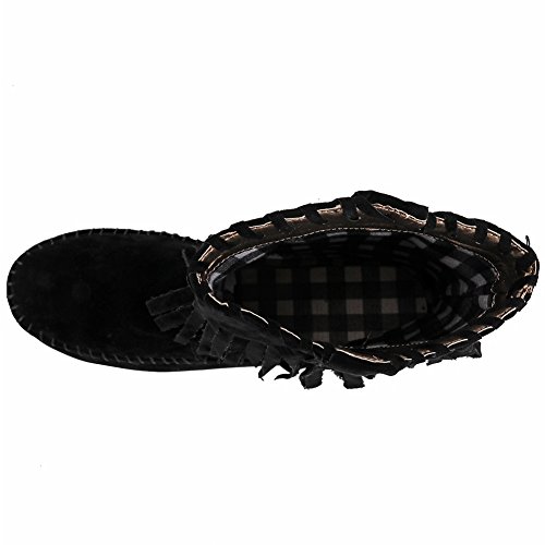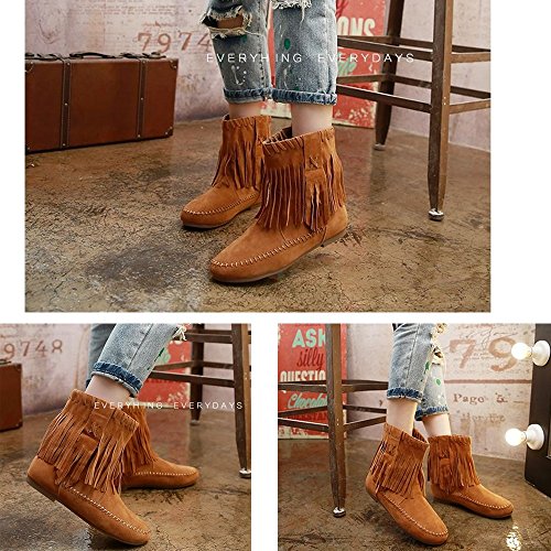 Binding : Apparel Product Description Item Type: Fringe Moccasin Boots Toe Type:Round Toe Closure Type: Pull on Closure Heel Type:Flat Low Heel Heel Height:0.6"(1.5CM) Shaft measure:6.7"(17CM) Boot opening: 11.8"(30CM) Outsole Material:Rubber Color:Black / Tan Shoe Width:Regular