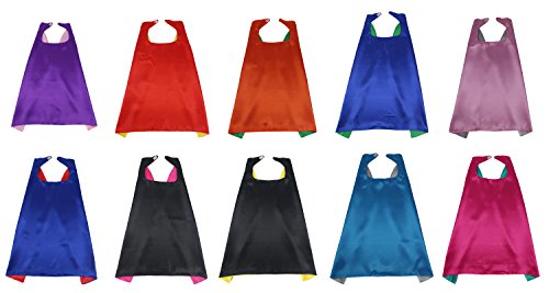 -. Brand : Higherplace -. Color : Multicolored -. Department : unisex-child -. Feature : ★One size fits most,70*70 cm. We have the same 10 pcs capes with 11 masks choice, this is the ASIN B01JP9GZSM / ★All the colors match are the same with the pictures. / ★Great choice for the parties .Great choice as a Birthday or Halloween Gift. / ★There is a Velcro closure at the neck which is very safe and easy for your hero when using it. / ★Made with high quality satin, double sided with 2 different colors. -. Label : Higherplace -. Manufacturer : Higherplace -. ProductGroup : Apparel -. ProductTypeName : CHILDRENS_COSTUME -. Publisher : Higherplace -. Size : 70cm*70cm -. Studio : Higherplace -. Title : 10pieces Boys&Girls Satin Superhero Capes Double-sided with 10 Colors -. UPC : 701722375307