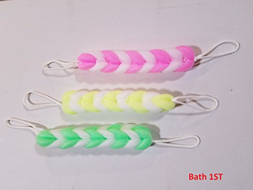 -. Feature : bath scrubs; excellent quality; durable; long lasting; / 3 pack; multi color; pink; green; yellow; / shower; loops; stretchable; money back guarantee / Scrubber; Pouf; rinses clean; / another excellent product from a brand you can trust 'Bath 1st'