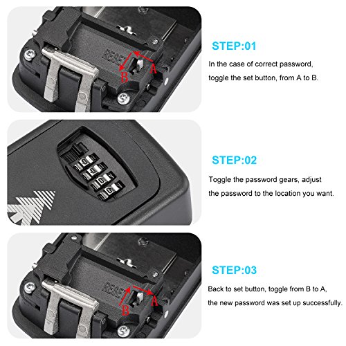-. Feature : 4 Password Gear -10000 kinds of password combination, you can according to your own needs set the password, easy memory, high security. / 4 Colors - Unmatched colorful key box on the market, BLACK / GREY / RED / BLUE. Satisfy your choice. / High Strength Quality - High strength steel plate, more sturdy, can withstand hammers, safer than regular safe deposit box. High strength alloy lock, more solid, more secure, effective resistance to violent destruction. / Re-settable Combination - for increased security, the key safe combination can be changed regularly. And just can change the password after you open the key box, one more protection, the use of more confidence. / This combination key safe box is ideal for securing keys, building access cards, emergency entry, home healthcare access, vacation homes, storing spare keys etc. Large storage capacity possible (170 Cubic centimeters) in this key box.