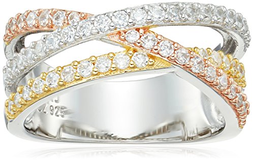-. Feature : Ring featuring sparkling Cubic Zirconia set in stylish crossover design with tri-tone bands of 18k yellow gold, 14k rose gold, and rhodium plated sterling silver / Cubic Zirconia (CZ) is an affordable, conflict-free alternative to diamond that reveals brilliant shine and a meticulous cut / Perfect jewelry gift to expand a woman's fashion wardrobe with a modern, on trend style / Beautiful right hand ring, cocktail ring, or statement ring / Hand-crafted in pure .925 Sterling Silver; 18k Yellow Gold, 14k Rose Gold, and Rhodium plating added to enhance design and appearance / Imported