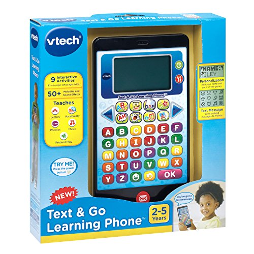 Text and learn on the go with the VTech Text and Go Learning Phone! Through five learning games, your child will learn letter order, beginning letters and phonics. They’ll also develop early literacy and writing skills by sending and receiving pretend text messages and fun e-cards. This toy phone can also be personalized with your child’s name which will be used in activities to enhance the role-play experience. Your little learner can also play fun activities featuring a cute owl character. Requires 2 AA batteries (batteries included for demo purposes only; new batteries recommended for regular use). Intended for ages 2 to 5 years.Feature