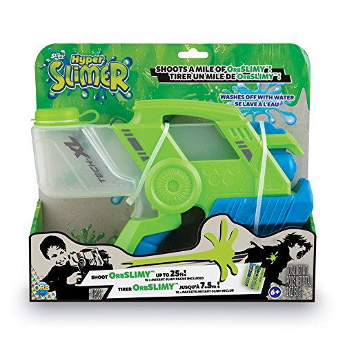 HyperSlimerTM is the greatest thing to ever happen in the world of slime! The instant slime has more blasts, and more distance than anything that's come before. Blast a total mile of slime! Blast slime in bursts up to 25 feet. HyperSlimerTM easily washes of with water. Empty the powder into the tank and fill with water. Give it a shake and you've made instant slime. Pump the blaster and out streams magnificent, easy to clean, non-staining slime! Empty the Slimy powder into the tank and fill with water. Give it a shake and pump out powerful bursts of green or blue slime. Out of Slime? The HyperSlimer also works as a water gun! This Slimy is completely water soluble, meaning it will never clog the gun and cleans easily off any surface.Feature