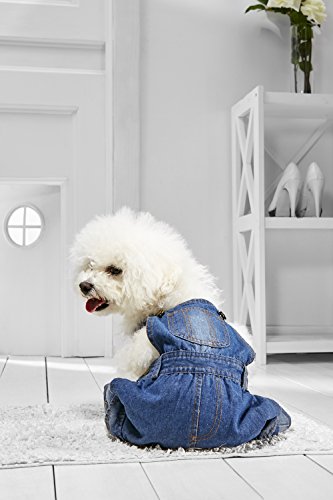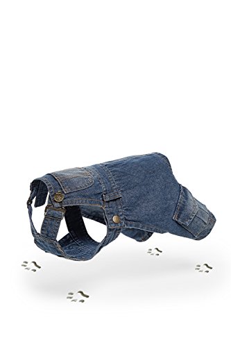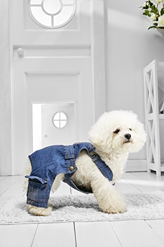 Cute and stylish denim overalls for your best four-legged friend! It is a perfect choice for daily walks and trips. The adorable jumpsuit made of a blue denim comes with buckles on the shoulders for adjustable fit. There are two side snap buttons for easy dressing. The jumpsuit leaves an opening for the dog to freely do his business as needed. The outfit has four functional pockets: on the front, back and both legs. Denim is very durable fabric, it will last many walks and outings. You mau complete the outfit with a dog t-shirt. Machine wash the jumpsuit at 86 °F or colder.