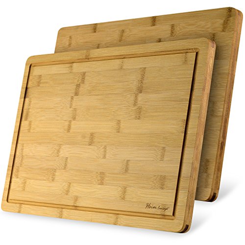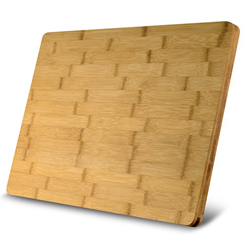 • EXTRA LARGE & DURABLE - Measures 18" x 12" x ¾" in and weighs 3.1 lbs providing space for heavy duty vegetable chopping, slicing fruits, and cutting meat. High quality bamboo resists knife scaring and warping