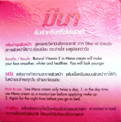 -. Binding : Misc. -. Brand : SMILE LANNA SHOP -. EAN : 8859055188322 -. Feature : Mena cream has been a best seller for years. It contains with vitamin E and antioxidants. The ingrediants combine to work miracles on spots, acnes and blemishes. Mena will help make your skin smoother, whiter and more beautiful. Mena helps lighten the appearance of acne scars and dark spots. / Quantity: 6 pieces x 3g./0.1oz. / Product of thailand -. ProductGroup : Beauty -. ProductTypeName : BEAUTY -. Title : Original Mena Cream Skin Whitening Acne/ Dark Spot Facial Moisturizer 6 Pcs.
