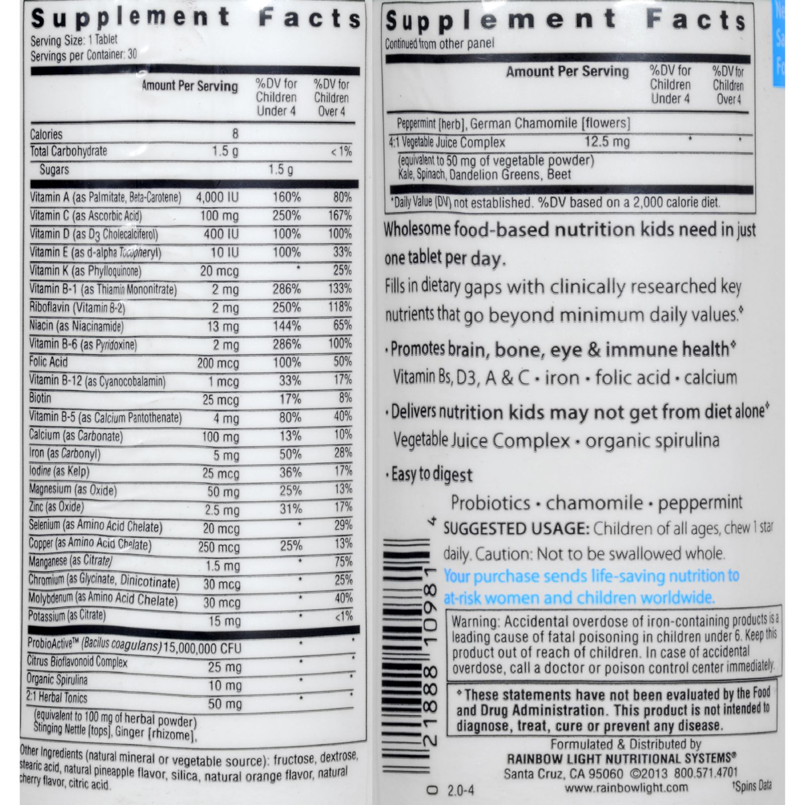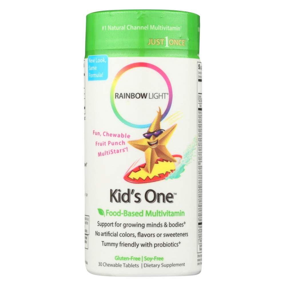 | Rainbow Light Kids One MultiStars Fruit Punch Description: Chewable Multivitamin/Mineral Wholesome vegetable Concentrates 15 Million Active Probiotics Fruit Punch Flavor A great-tasting star-shaped fruit punch chewable kids are sure to love. Kids One Chewable Multivitamins/Mineral provides a balanced profile of the essential nutrients kids need for healthy growth, plus the nourishing goodness of vegetable concentrates they might not be getting from their diet alone. Probiotics are also included to support natural digestion and promote immune health. Free Of Articifical colors, flavors, sweeteners, preservatives, lactose, gluten, yeast, milk, eggs, soy, nuts, fish/shellfish and wheat. Disclaimer These statements have not been evaluated by the FDA. These products are not intended to diagnose, treat, cure, or prevent any disease.Ingredients : Vitamin A, vitamin C, vitamin D, vitamin E, vitamin K, thiamin, riboflavin, niacinamide, pyrodoxine, folic acid, cyancobalamin, biotin, pantothenic acid, calcium, iron, iodine, magnesium, zinc, selenium, copper, manganese, chromium, molybdenum, potassium, citrus bioflavonoids, PABA, spirulina, stinging nettles, ginger, peppermint, German chamomile, kamut leaf juice, barley grass, oat grass juice, alfalfa leaf juice, dandelion greens, carrots, collards, cauliflower, stinging nettles, parsley, onions, fructose, dextrates, natural orange, pineapple and cherry flavors, vegetable stearine, silica, magnesium stearate and citric acid. Country of origin : USA Gluten Free : Yes Size : 30 TAB Pack of : 1 Product Selling Unit : each |