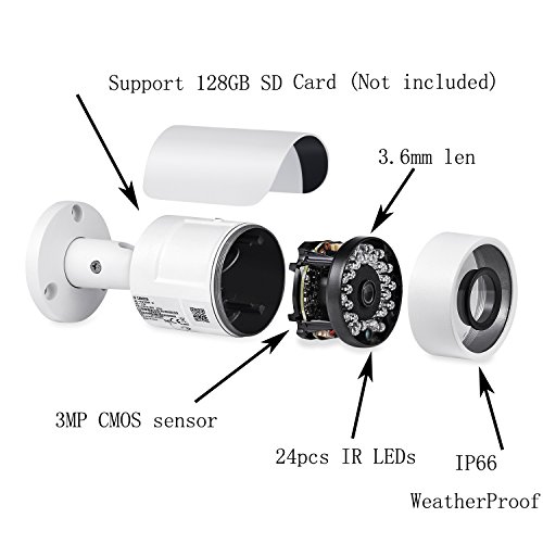 -. Feature : WiFi signal range:Wi-Fi(IEEE802.11b/g/n),150ft in open field / Remote Anywhere:After install Mobile App - EasyViewer(iphone) or Easy4ip (Android) ,you can enjoy remote viewing and make sure that everything runs smoothly as you can have access to the camera via your iPhone, iPad / 3MP QUALITY IMAGE:This camera features a 1/3'' 3 Megapixel Progressive Scan CMOS that have a 2048 x 1536, 3MP video resolution, 3.6mm wide angle fixed lens and 24pcs infrared LED that provides a clear, 100 feet night vision / Motion-Detection trigger E-mail Alert and FTP upload, and Work With Blue iris and other third Softwares,Work with NVR that support Onvif . Please enable motion detection function first. This product doesn't include microphone inside. / Support SD Card Recording,Micro SD card slot up to 128GB,Not included. Support E-mail:support@alptopsecurity.com
