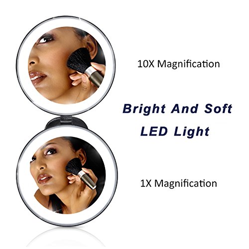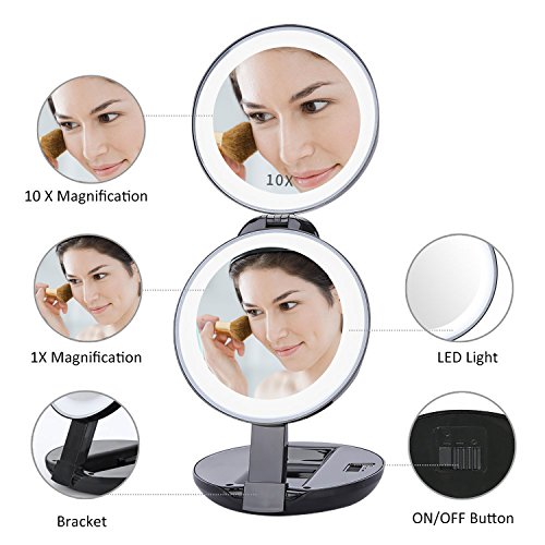 - 10X Magnification, Beauty in Details: This professional illuminated mirror is designed with two round mirrors. One as 1X normal mirror, one as 10X magnified mirror so you can easily check and paint the eye makeup without losing any details.