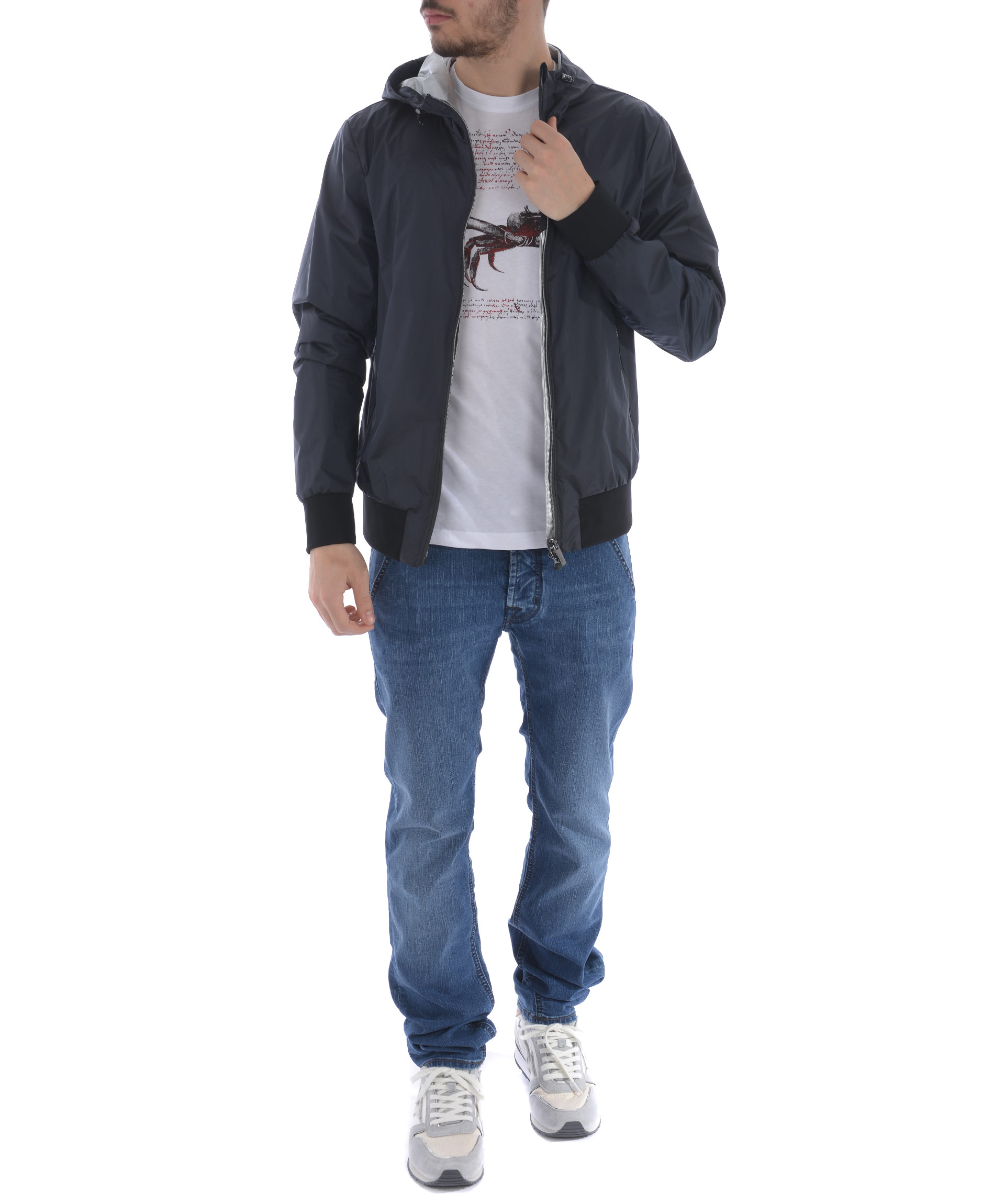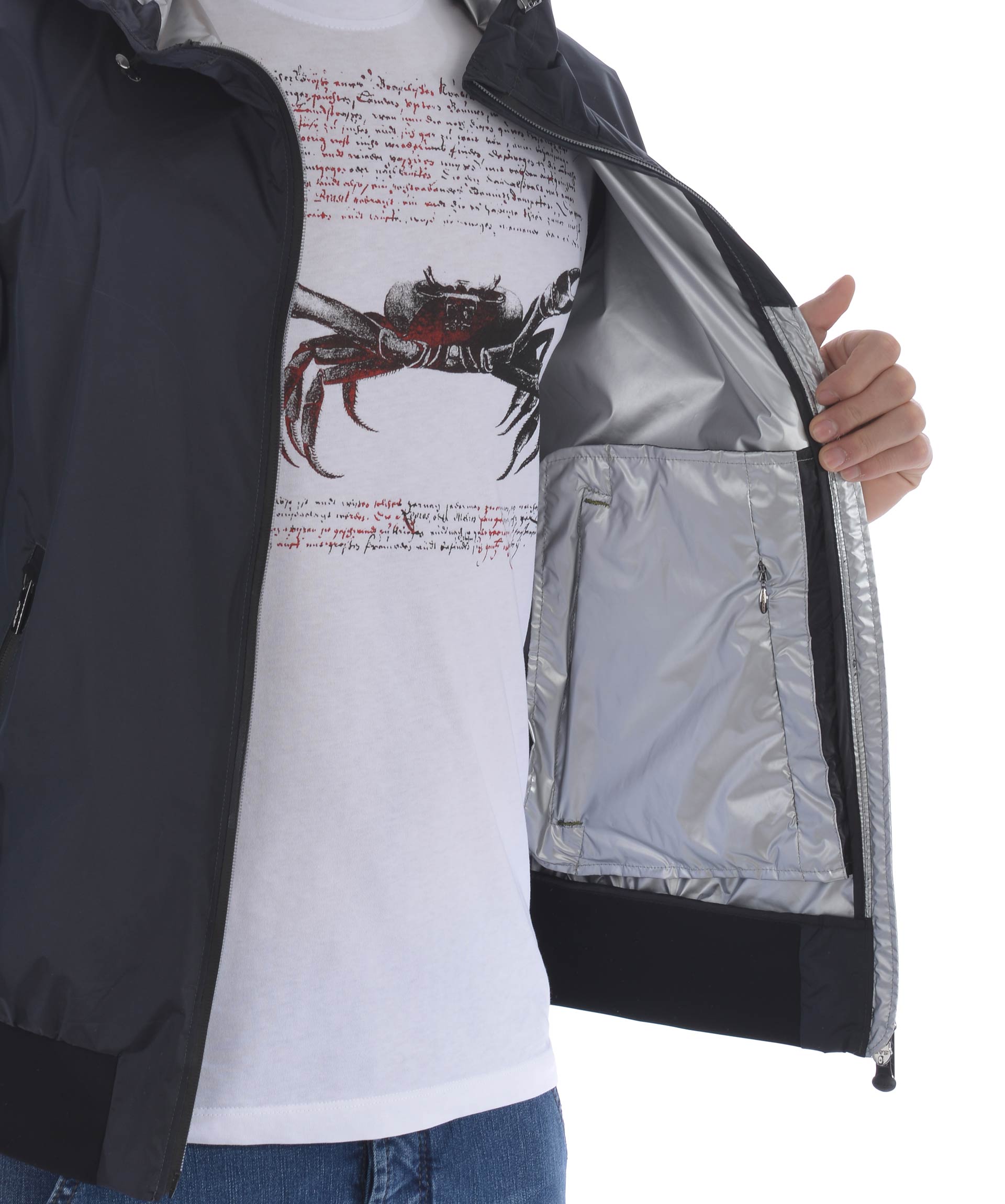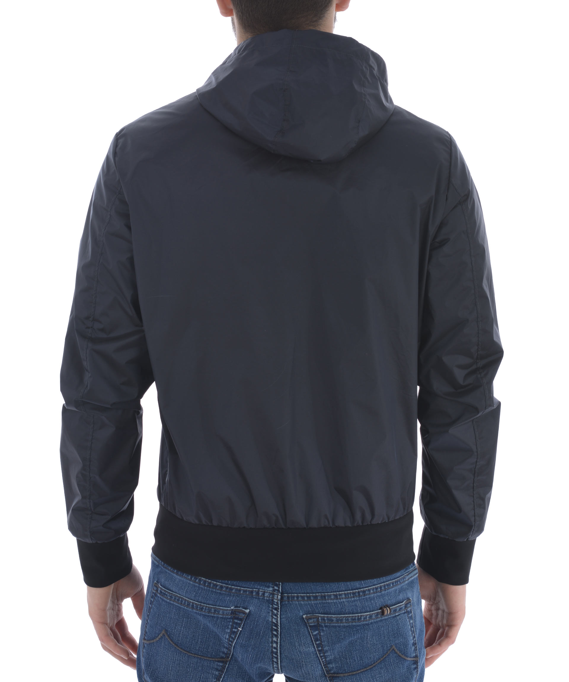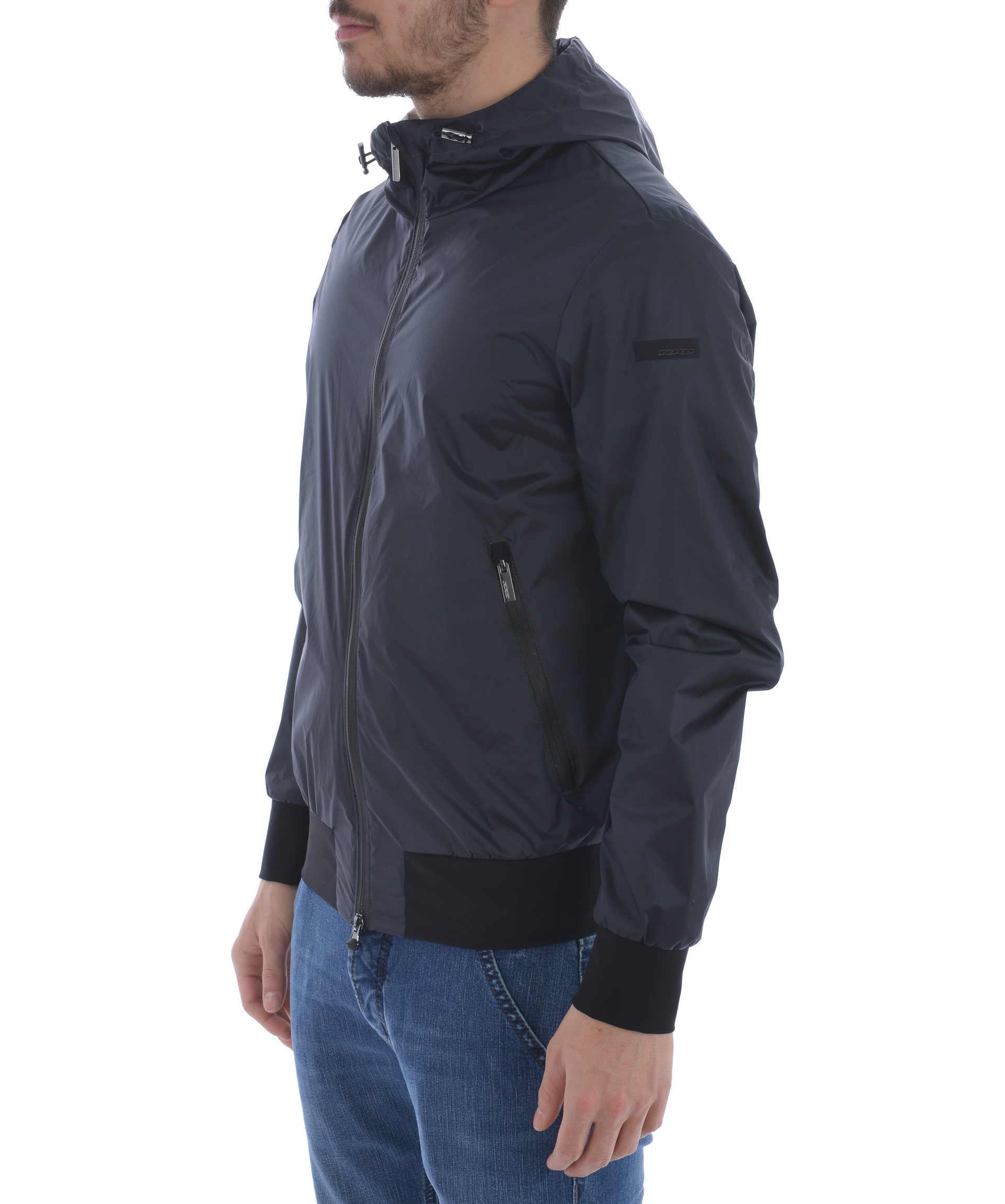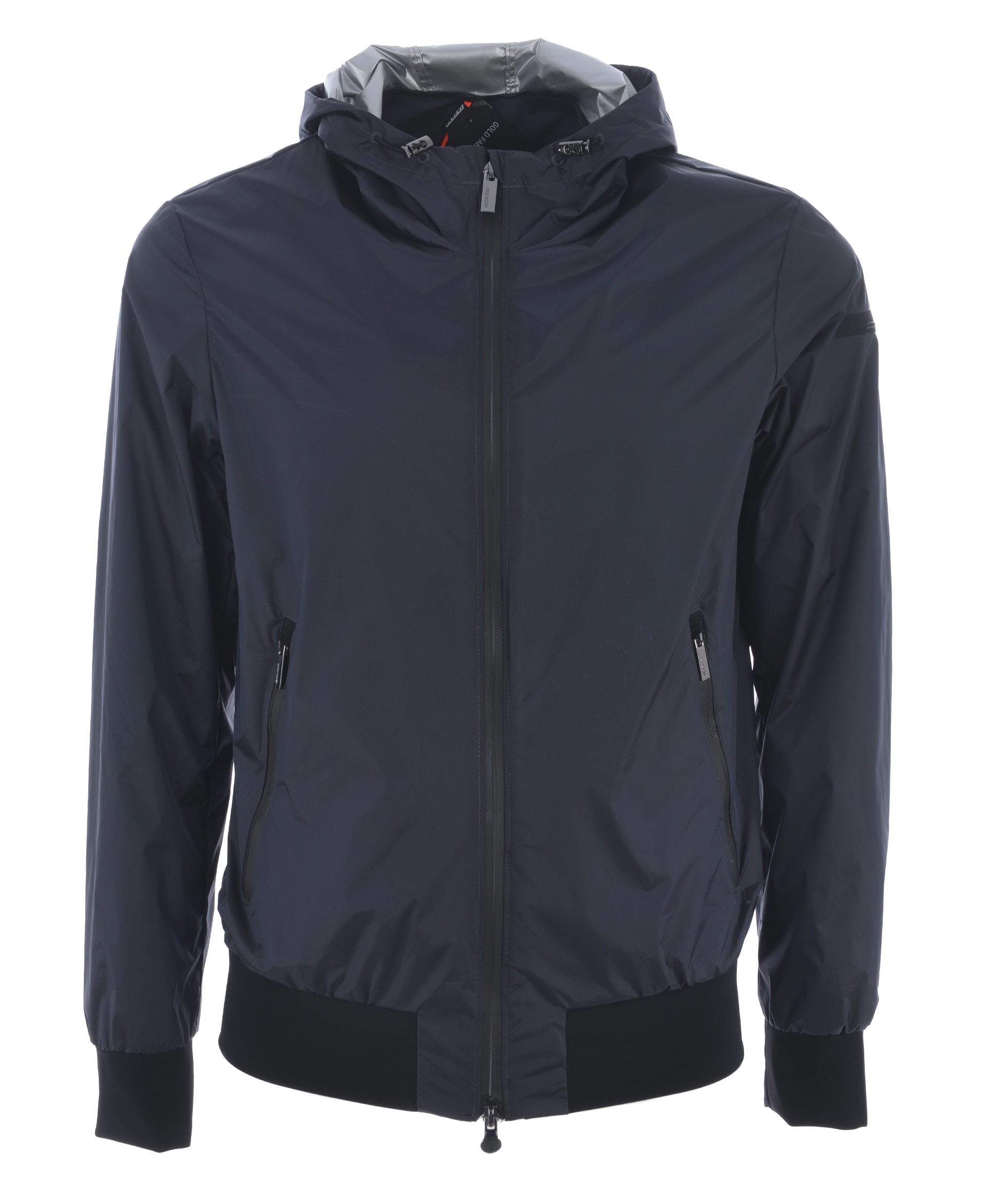 Giubbotto RRD in nylon Blu scuro cangiante. Impermeabile, antivento. Cappuccio con coulisse. Tasche frontali con zip. Chiusura con zip doppio cursore. Tasca interna con zip. Polsi e fondo in lycra. Fodera in nylon spalmato oro.