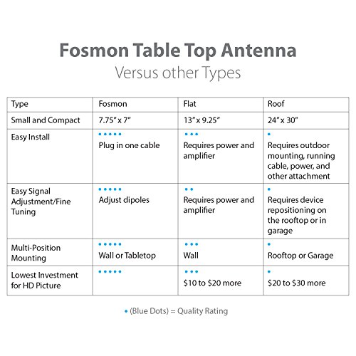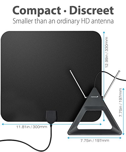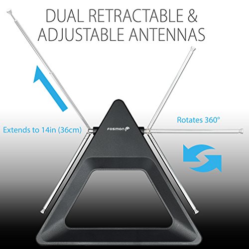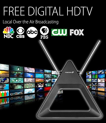 Studio : Fosmon Publisher : Fosmon Binding : Wireless Phone Accessory Product Description HDTV Antenna for Free HDTV No more expensive cable bills! With Fosmon's HDTV antenna, you cana receive up to 1080p HD content/channels from local over the air broadcasting towers and TV stations. This HDTV antenna can pull in local news, sitcoms, television shows, kids' and sports programs in full HD. It connects to the antenna/cable port of your TV set. Versatile Placement with Long Cable Easy to install with the ability to sit on a table top or mount on a wall with 2 screws (hardware included). No battery or AC power is required. With the long 16.4ft / 5m cable easily place this antenna anywhere near your TV. 25 Mile Maximum Signal Range This antenna receives signal up to 25 miles / 40km from local towers and TV stations. Adjustable Dipoles/Rabbit Ears Fosmon's HDTV antenna has retractable and adjustable dipoles/rabbit ears for optimal reception. Limited Lifetime Warranty Your product is included with a limited lifetime warranty. Please visit Fosmon's website for more details. What's Included HDTV Antenna x1 User Manual x1 Screws x2 Anchors x2 Specifications ? Signal Type: Digital HDTV ? Operating Distance: 25 Miles / 40 km ? Frequency: VHF (174-230Mhz) / UHF (470-862Mhz) ? Impedance: 75Ω ? Mounting: Table top or Wall Mount ? Connector: F Type Coaxial Male ? Cable Length: 5FT / 1.5m ? Antenna Base Dimensions: 197x197x15mm (7.75x7.75x0.6in)