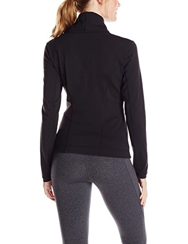 Moisture-wicking jacket with asymmetric zip front featuring funnel-neck collar with snap closure