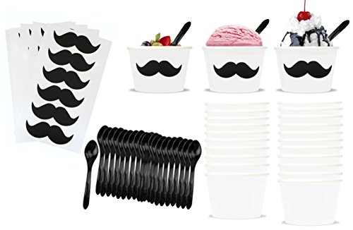 Mustache Theme Ice Cream Set with 8 Ounce Paper Cups, Plastic Spoons, Mustache Chalkboard Labels Black, White 24 Each by Outside the Box Papers