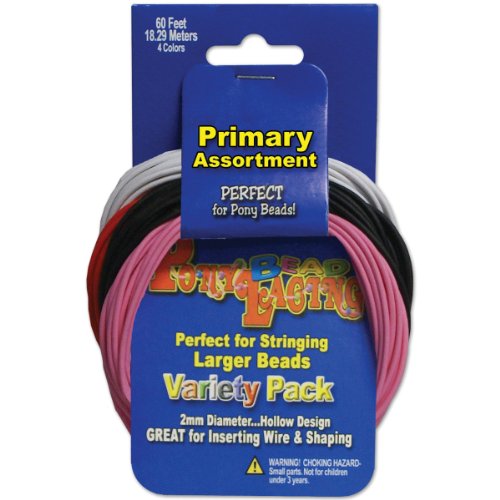 PEPPERELL-Pony Bead Lacing. This colorful cording is great for pony beads and other kids crafts. It has a 2mm diameter that makes it great for stringing larger beads and a connector piece is included for joining ends together. This lacing has a flexible rubber-like texture that has the incredible ability to recover its shape if it is ever bent or dented simply place it in boiling water. This package includes four colors of lacing (15 feet each; 60 feet total) and one connector piece. Recommended for ages 6 and up. Non-toxic.Feature