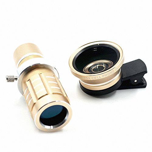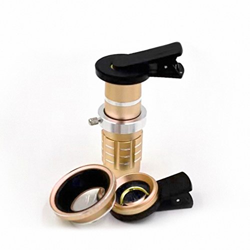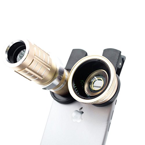EXPAND YOUR CREATIVITY – Top-grade Professional HD 12X Telephoto Telescopic Lens w/ 0.45 SLR Wide Angle Macro Camera Universal Clip-ons Lens Kit Military Grade Build for iPhone 6 / 6S Plus, Samsung Galaxy S Series and more Windows/Android Smartphones in the market. Color: Gold