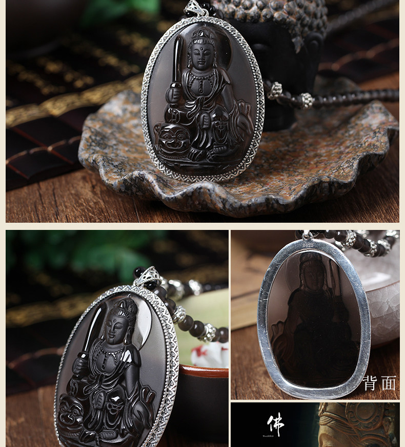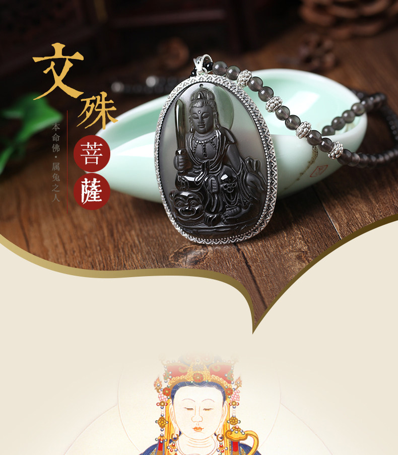 开光天然冰种925银包边黑曜石文殊菩萨生肖兔本命佛守护神吊坠