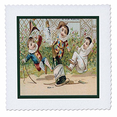 3dRose qs_180196_4 French Champagne Bottle Popping Cork with Three Little Clowns Quilt Square, 12 by 12"