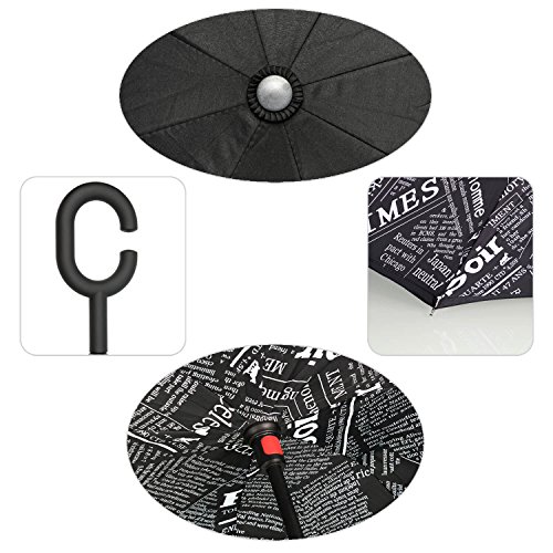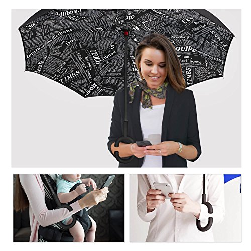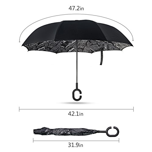 -. Feature : ANTI-ULTRAVIOLET - UPF>50+ Sunscreen fabric production, Double layer protection, Light transmittance is "0". / DRIP FREE - Creative investing design, inside-out design prevents water from dripping, keeping floors and cars dry. / HANDS FREE - Great for phone user and mothers, Cross the C-shape handle over your arm, made you hands free for holding a baby, bag or mobile if needed. / INVERTED DESIGN - The surface of the umbrella cloth wet will cleverly folded. So it won't get wet when you get in or out of the car. / DOUBLE PROTECTION - Windproof and UV proof, Inverted Reverse umbrella, Protect you from wind and rain or sun at anytime.