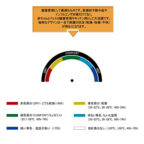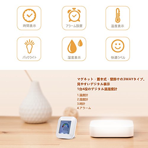 -. Feature : 【温湿度計】室内で温度と湿度を測した便利な置き掛けやマグネット掛けた温湿度計です。 / 【4in1機能】1台4役のデジタル温湿度計です。タッチ式で温度や湿度はご利用だけじゃなくて、時計表示やアラーム設置でもいいです。 / 【快適レベル表示】一目で部屋の状況(乾燥/快適/不快)が分かる3段階の快適レベル表示。違い色は違い室内状況を表示しています。 / 【健康管理】健康管理として最適なものです。乾燥肌や熱中症やインフルエンザ対策だけでなく、赤ちゃんとペットの健康管理やキッチン用として大活躍です。独特なデザインは一目で部屋の状況(乾燥/快適/不快)が明るくになります。 / 【使いやすい】▲電池を入れて、温湿度は測るすることができます。▲「UP」は押して、当日最大の温湿度は見ることができます。チェックした順番は「MAX(最高)-MIN(最低)-OFF(閉める)」▲[MODE]は押すと、時間やアラームは設置できて、その機能の設置順番は時計-アラーム-時計になります。▲[MODE]は3秒間を押すと、時計やアラームの時間を設置して、「DOWN」「UP」は数値の選択機能です。時と分は選択完了して、「MODE」はもう一度押してください。