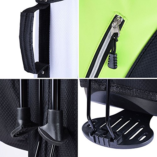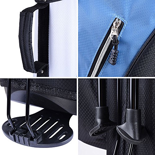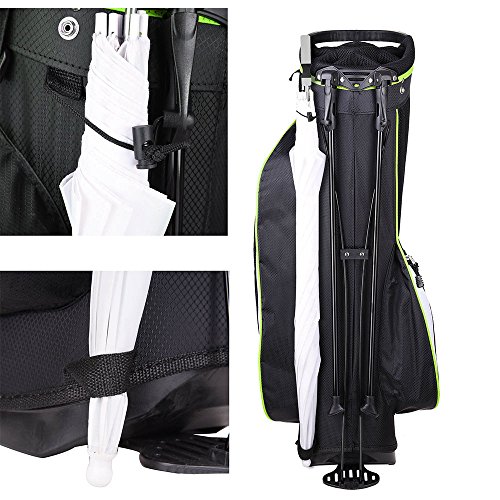 Product Size: 15'L x 11.8'W x 35.4'H Product Weight: about 5lbs The length of Metal stand leg is 26', the diameter is 0.73", wide 24" leg span for stability; Base:11'x7.87' Large Capacity: 14 Golf CLUBS