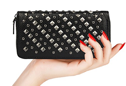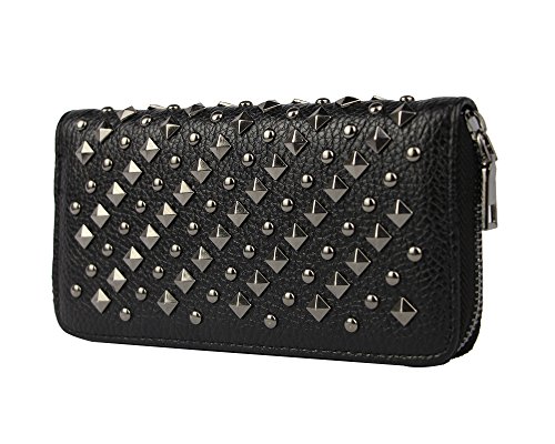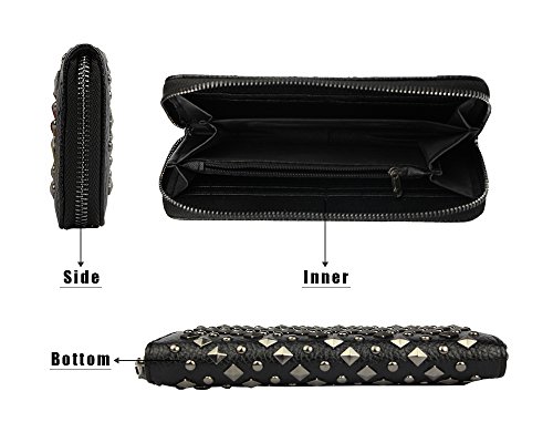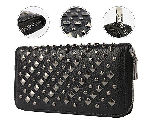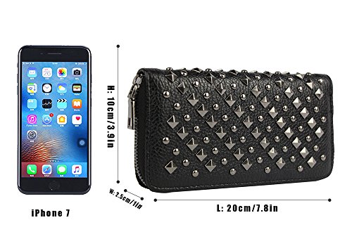 -. Feature : Material: Faux leather / Size: 7.8"L x 3.9"H x 1" W / All-over studded by vintage rivets; Top zip closure / Zip closure Features 8 credit card slots, 2 full-length slit cash compartments and 1 full-length zip pocket / Extremely Practial -- Cell Phones, ID cards, credit cards, tickets, cash, money, coins and so on can all be well placed